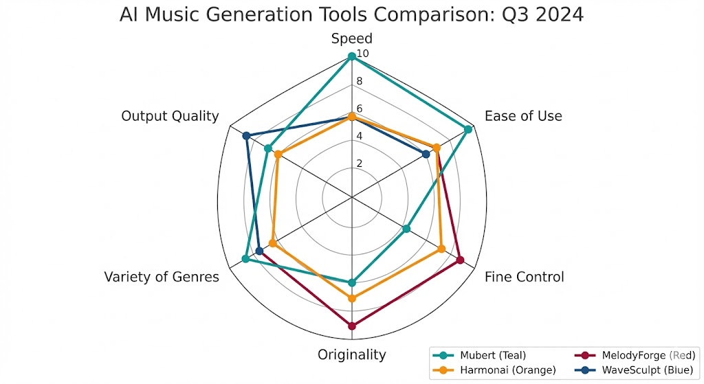 Compared it to competitors. I used the same prompts across Mubert, Soundraw, AIVA, Boomy, and Beatoven.ai to see how they stacked up. Mubert isn't the best at everything, but it's the fastest.